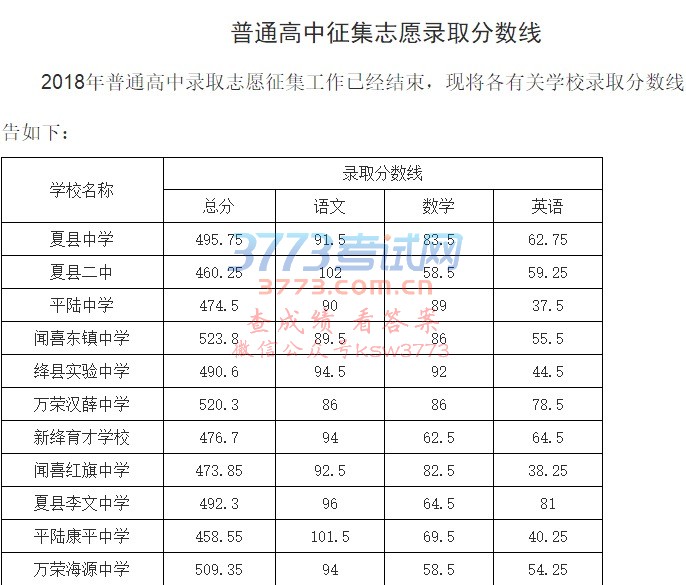 2018年普通高中录取志愿征集工作已经结束,现将各有关学校录取分数线公告如下: