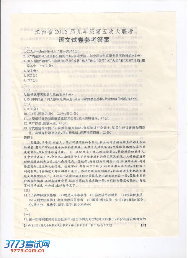 2013江西省中考大联考语文试卷及答案