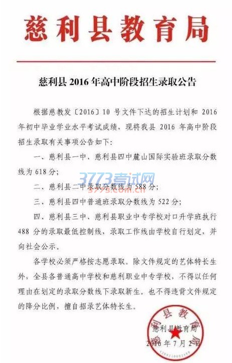 2016慈利县中考分数线 慈利县高中录取