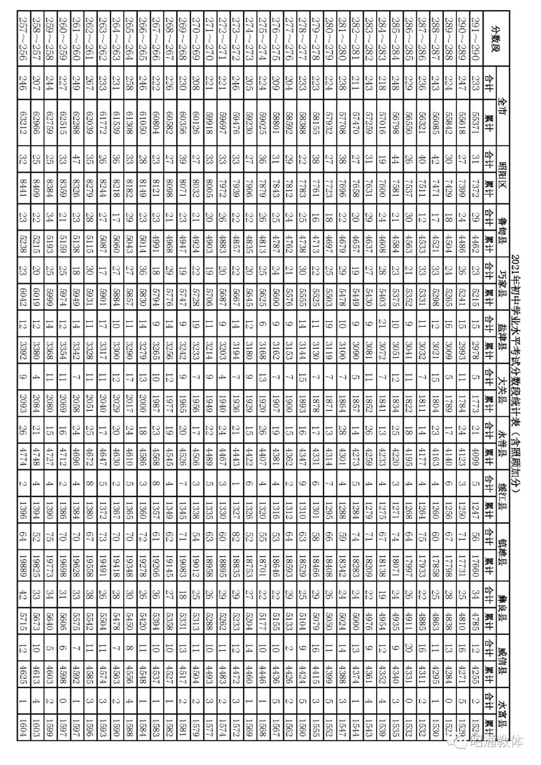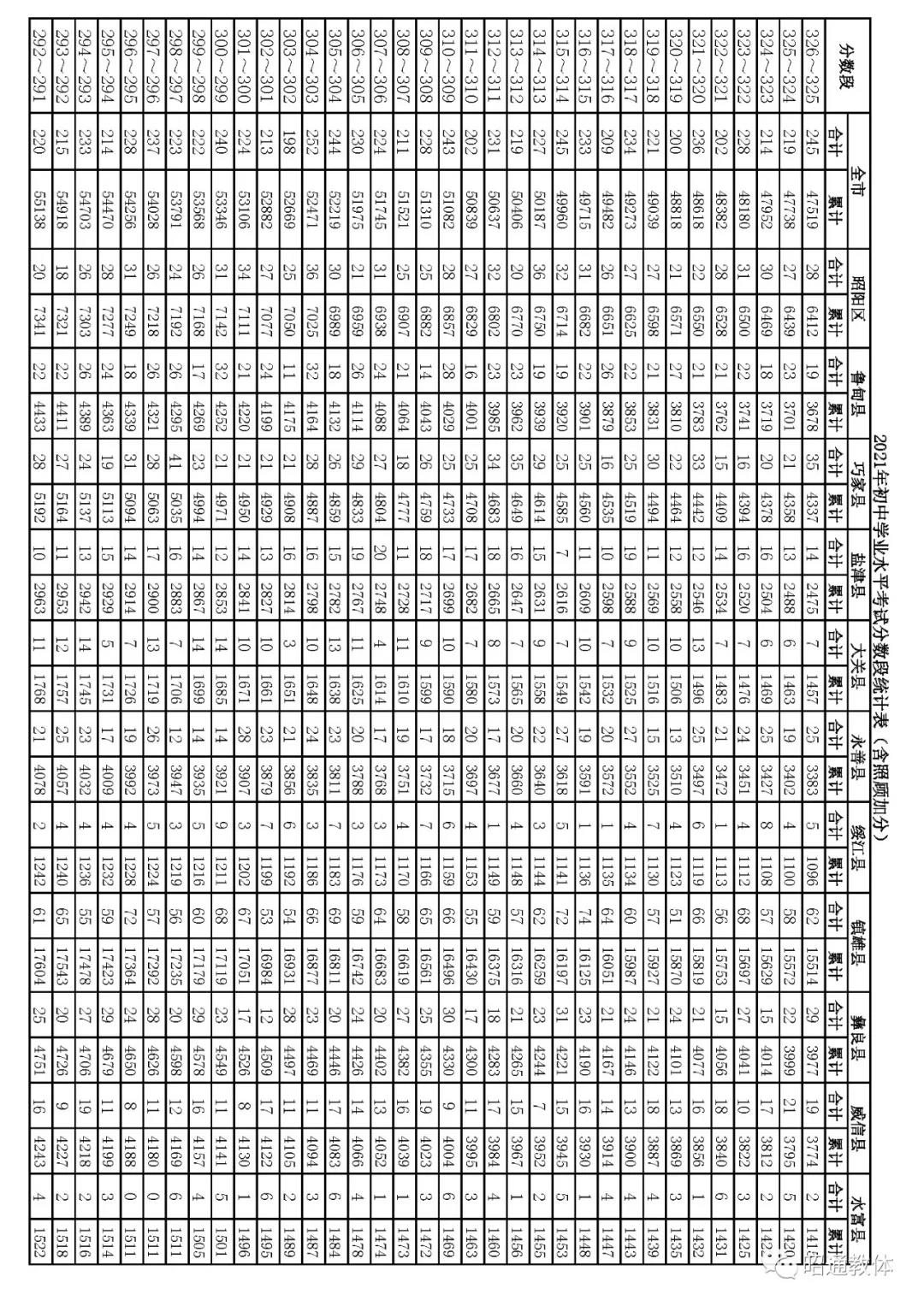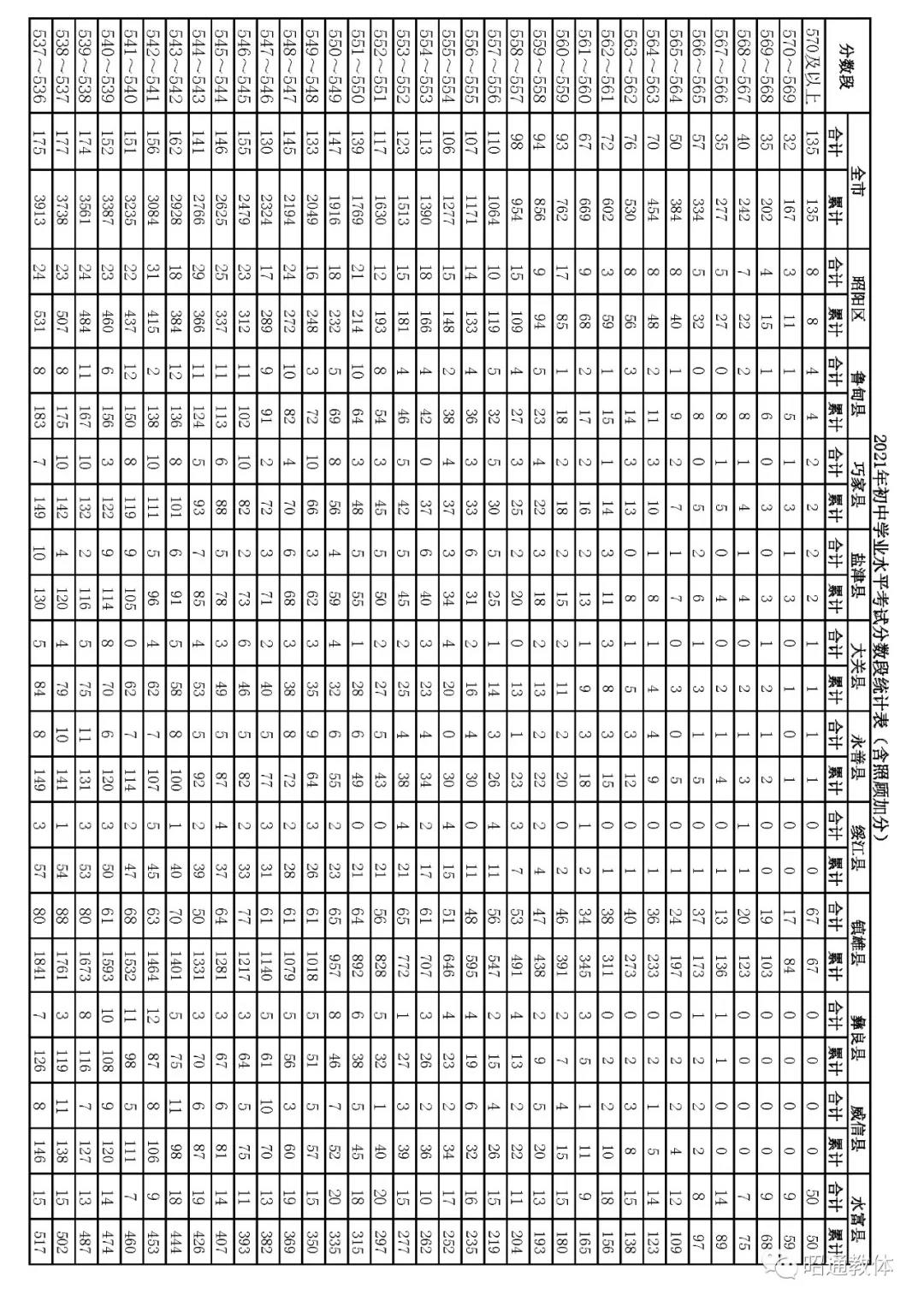 2021年云南昭通中考成绩一分一段统计表