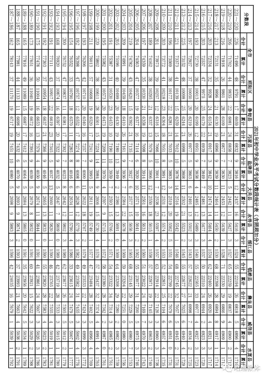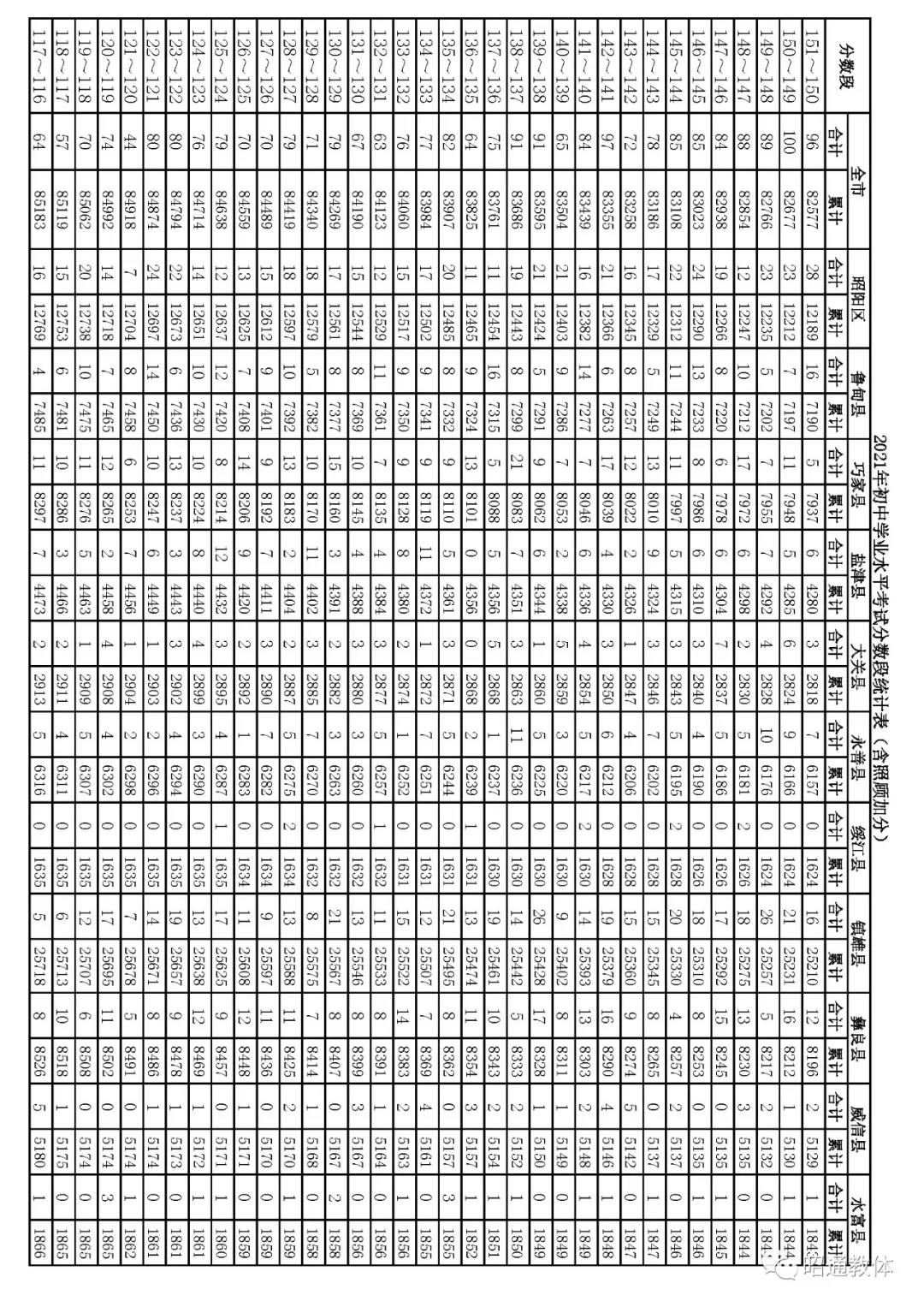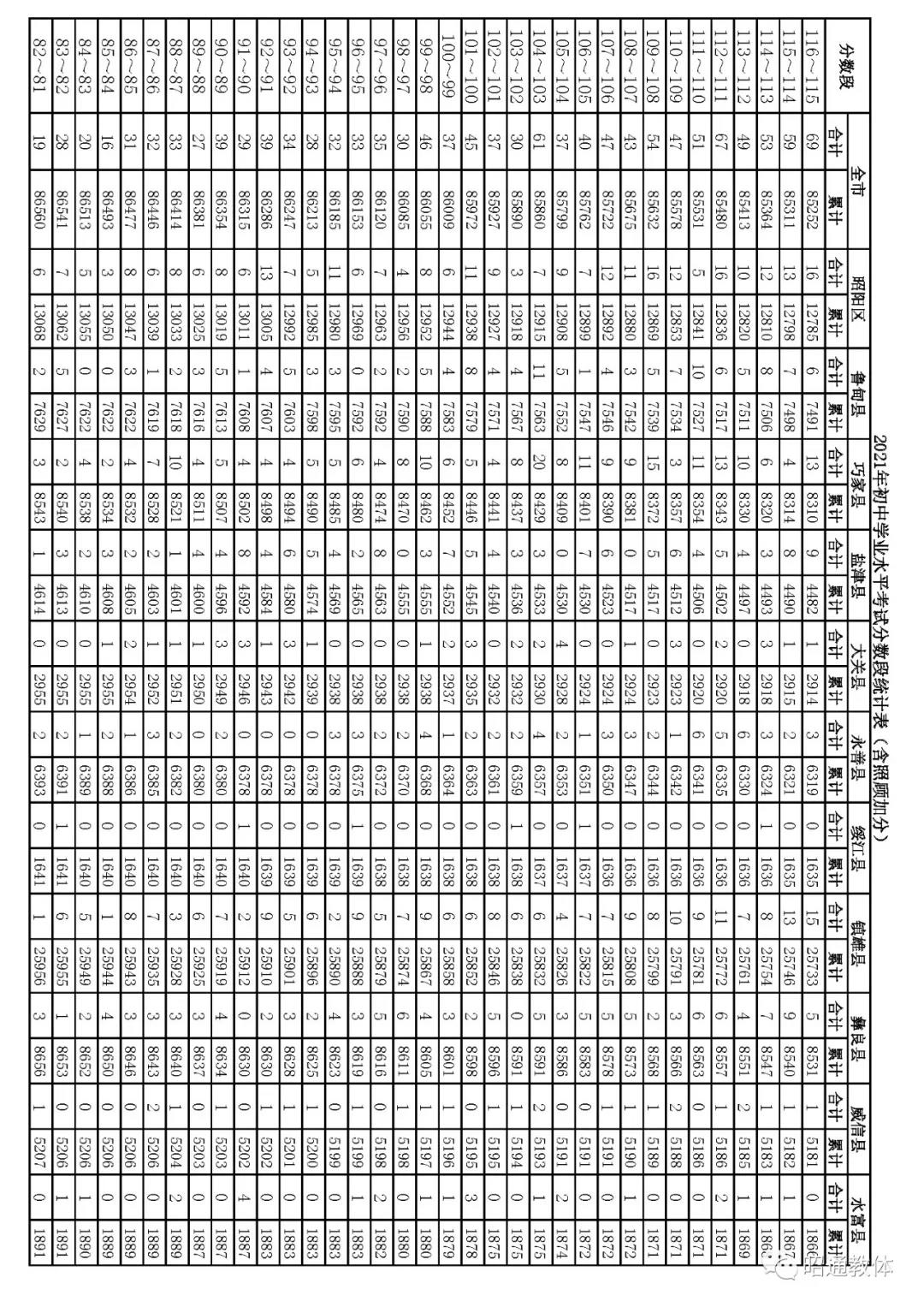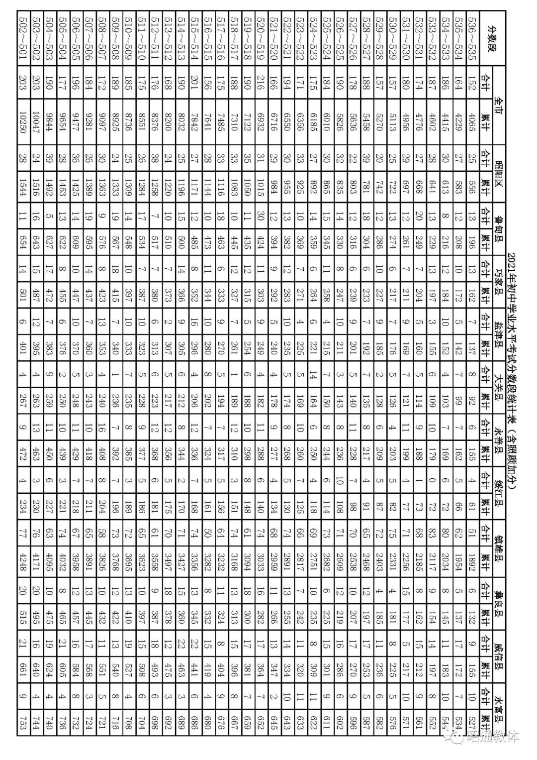2021年云南昭通中考成绩一分一段统计表