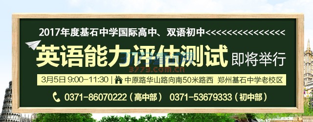 郑州市基石中学2017年度国际高中、双语初中英语能力评估测试将于3月5日正式启动,本次英语能力评估测试是就读我校国际高中、双语初中的重要参考标准,也是对学生阶段性学习成果评估,为升学考试提供参考。测试地点位于郑州市中原路华山路向南50米路西郑州基石中学老校区,请有报考意愿的家长们提前预约。