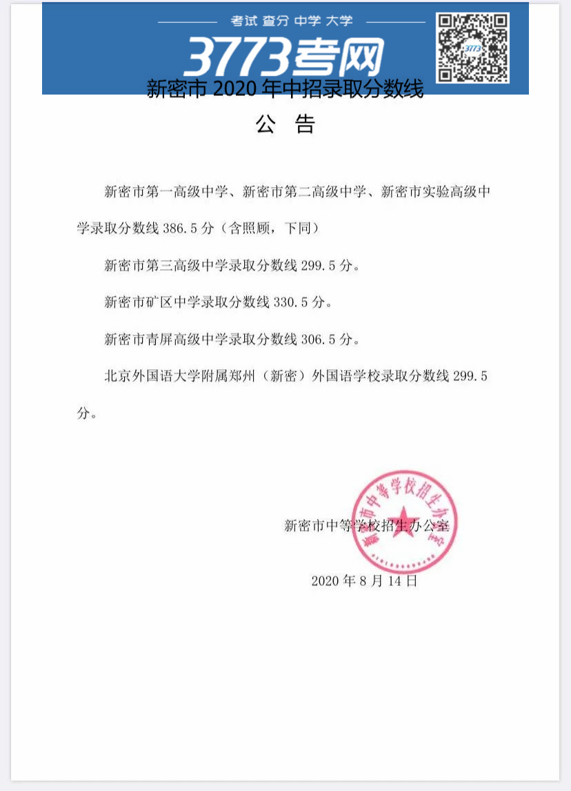 刚刚!记者从新密市教育局了解到,今年中招录取分数线正式公布。新密三所重点高中录取分数线为386.5分。今年分数线较往年低,是因为总分少了100分,分别是体育70分和理化生实验操作30分。