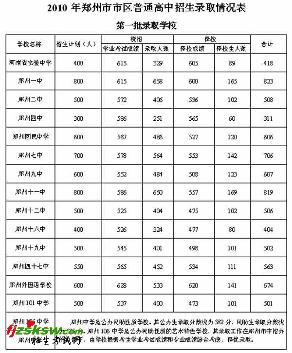2010郑州市中招各高中录取分数线如何划