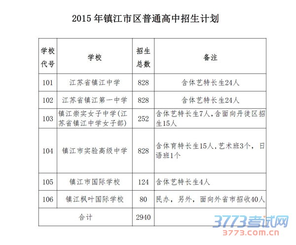 镇中、一中、实验高中均为828人,18个班,每班46人,其中实验高中包含3个艺术班,1个日语课程实验班;崇实女中6个班,每班42人,其中面向丹徒招收学生不超过15人;国际学校4个班,每班31人左右。镇江枫叶国际学校市内80人,合计2940人。另外,我们今年把各校体艺特长生的招生计划列入总计划,一并向社会公布。镇中、一中各24人,实验高中15人,崇实女中7人,国际学校4人,具体的特长项目、每个项目的招生人数、报考条件、测试办法、录取条件等已经在各校网站公布,供家长参考选报。