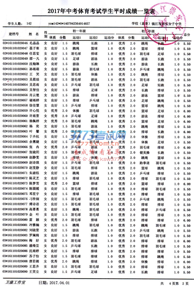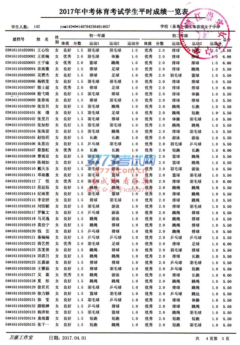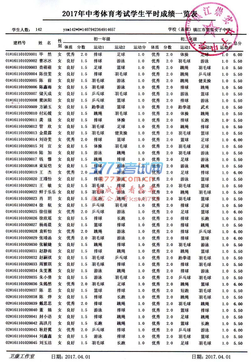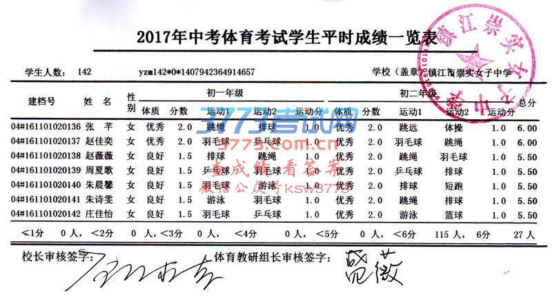 2017镇江崇实女子中学中考体育考试学生平时成绩公示