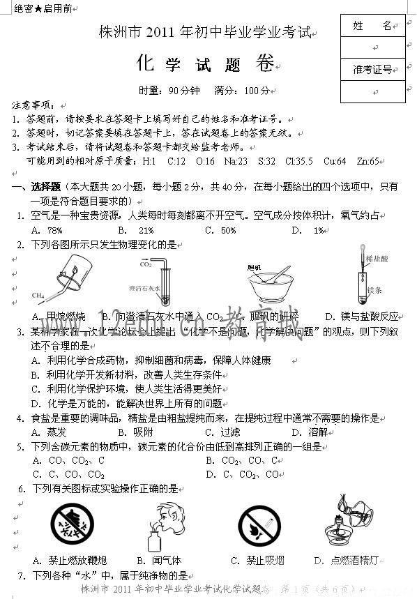 2011株洲中考化学试题试卷及参考答案