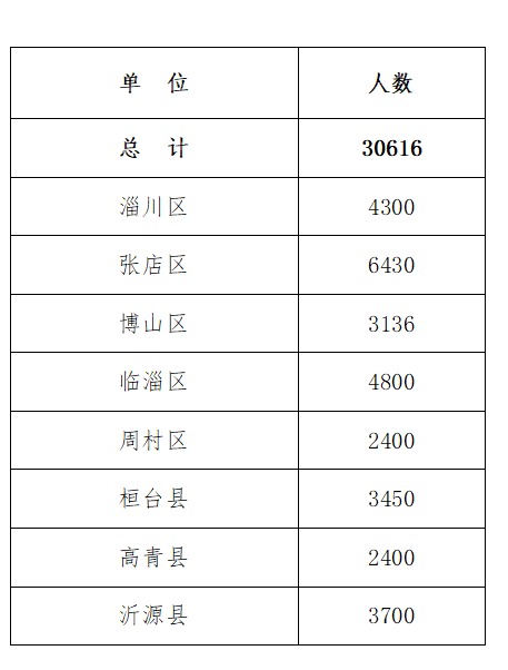 单位:人单 位 人数总 计 30616淄川区 4300张店区 6430博山区 3136临淄区 4800周村区 2400桓台县 3450高青县 2400沂源县 3700