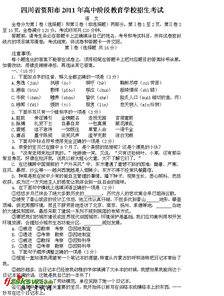 2011年浙江嘉兴、舟山中考数学试题及答案