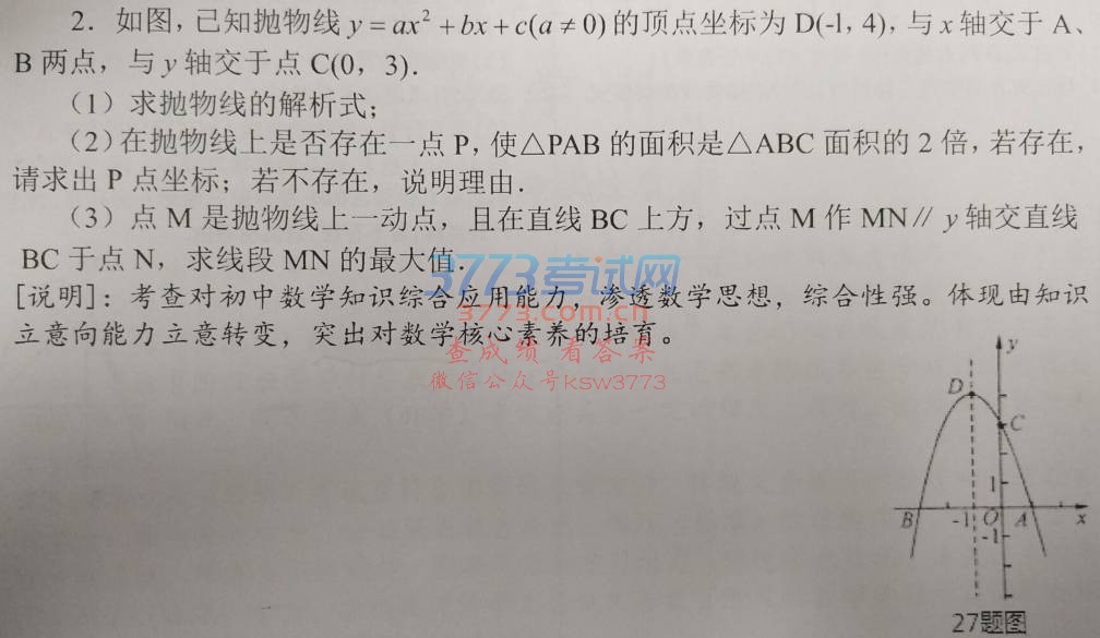 与2017年相比,题型示例中新增二次函数综合题,体现对核心素养的要求: