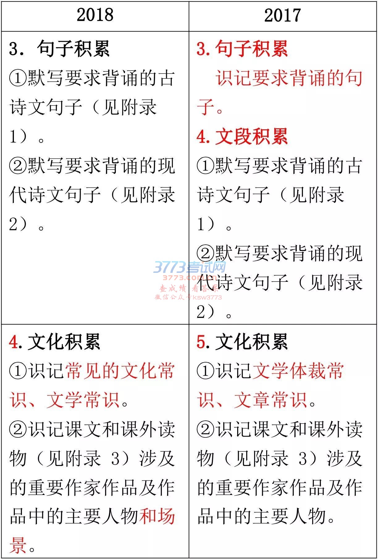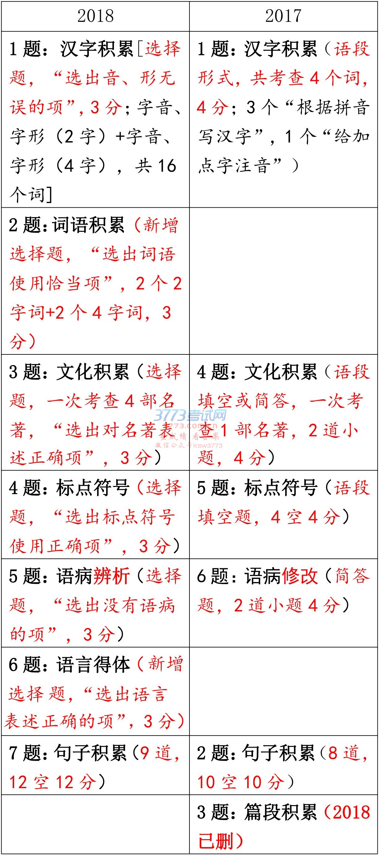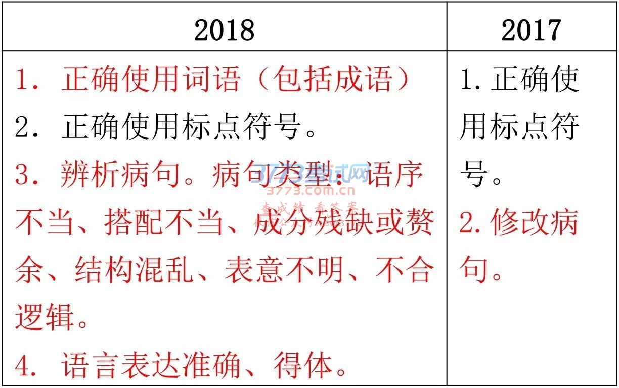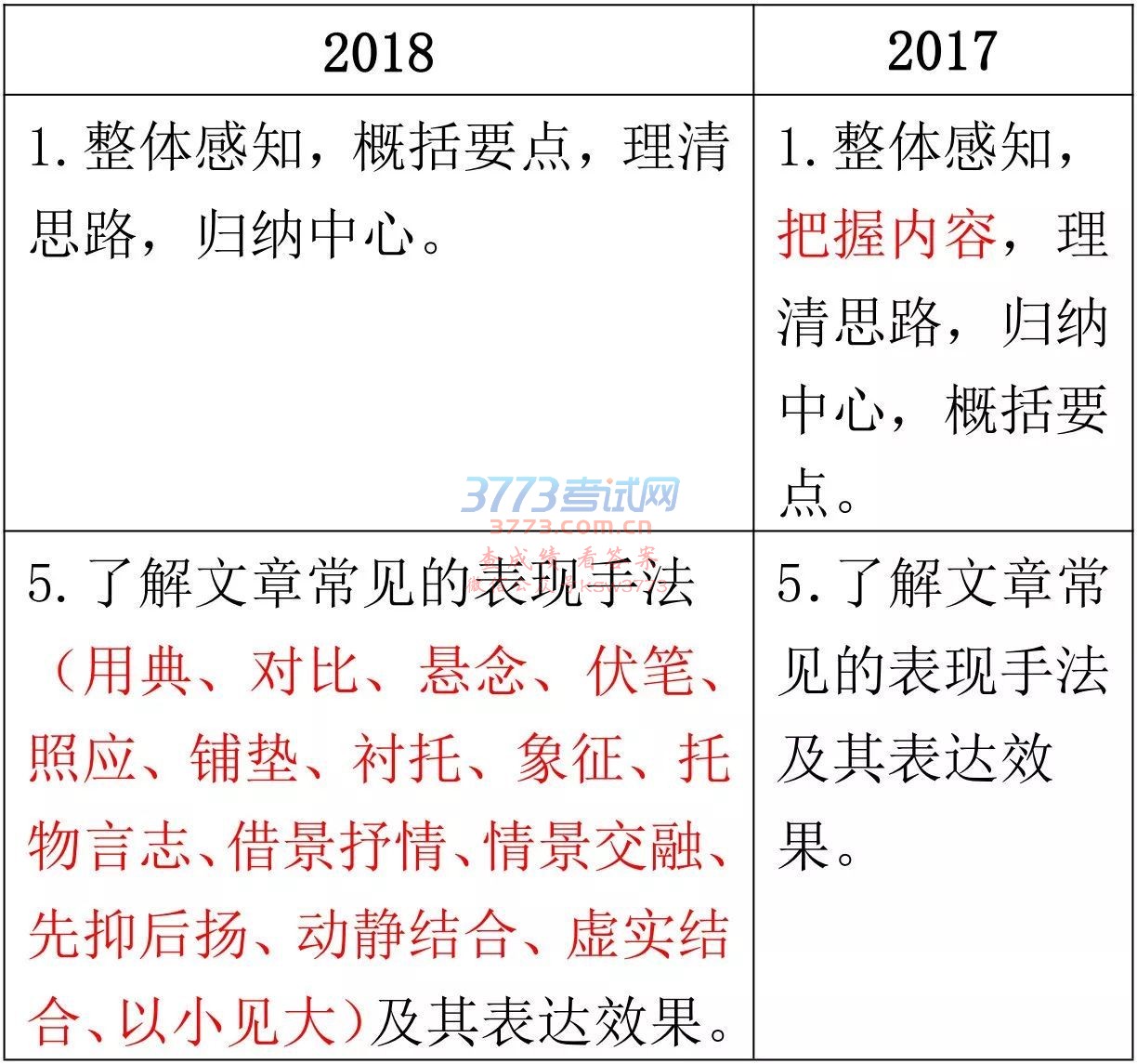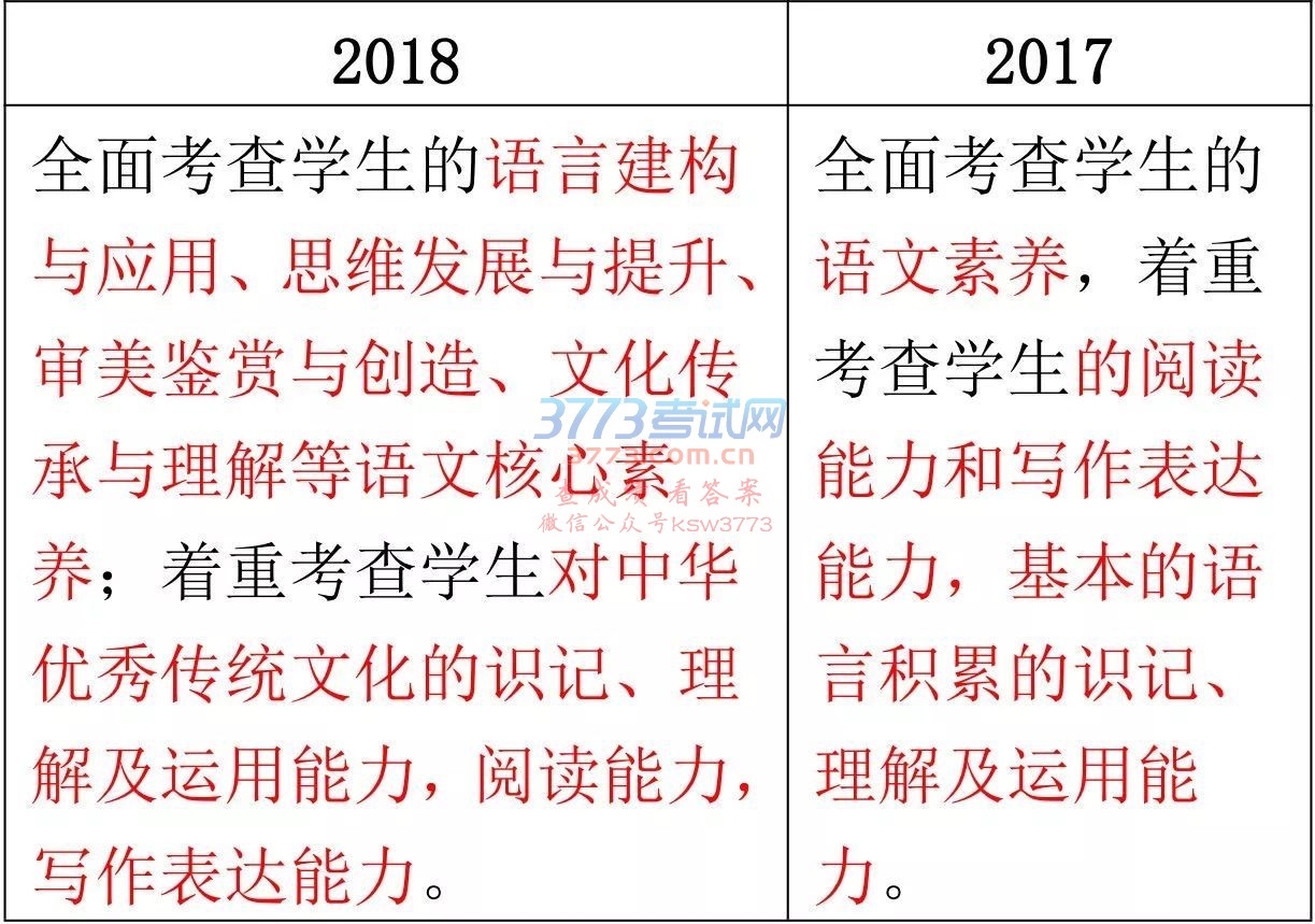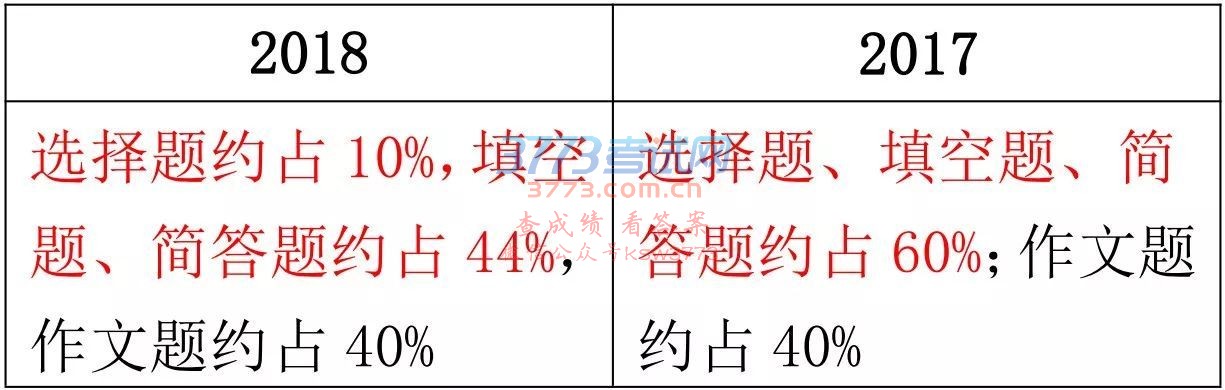 与2017年相比,2018年在考试性质、试卷结构、能力要求、考试内容、题型示例及样卷中均做了调整。值得关注的变化具体如下(红色字体为区别、变化):