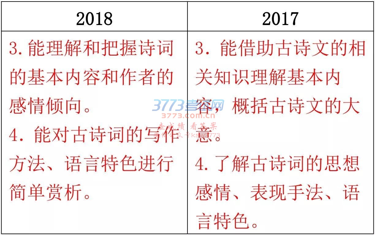 2017年《实施意见》明确考查“积累、理解、运用、分析”四种能力;2018年则变为考查“识记、理解、运用、分析”四种能力。