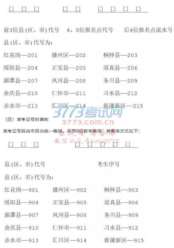 报名号按9位数字编排,前3位为县(区、市)代号,4、5为报名点代号,后4位为报名点流水号。编制规则如下: