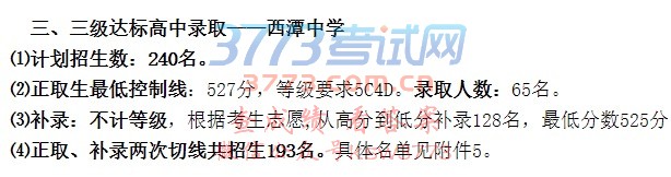 三级达标高中录取——西潭中学 ⑴计划招生数:240名。 ⑵正取生最低控制线:527分,等级要求5C4D。录取人数:65名。 ⑶补录:不计等级,根据考生志愿,从高分到低分补录128名,最低分数525分。 ⑷正取、补录两次切线共招生193名。
