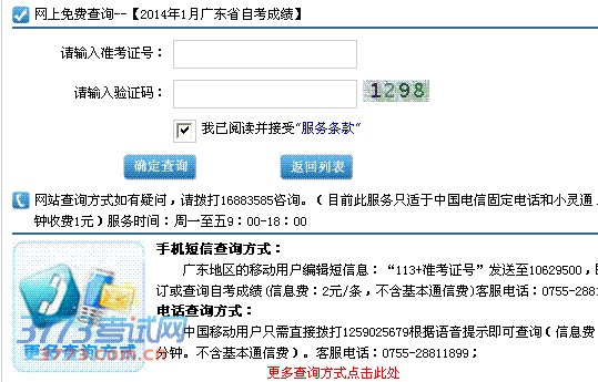 2014年1月广东省自学考试成绩已公布,考生可通过以下方式查询: