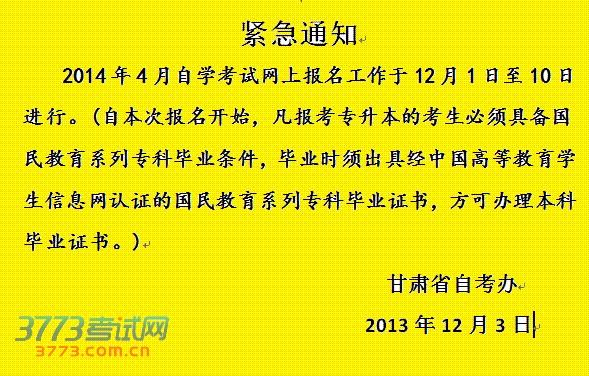 2014甘肃自学考试网上报名紧急通知。2014年4月甘肃自学考试网上报名工作于12月1日-10日进行,自本次报名开始,凡报考专升本的考生必须具备国民教育系列专科毕业条件。
