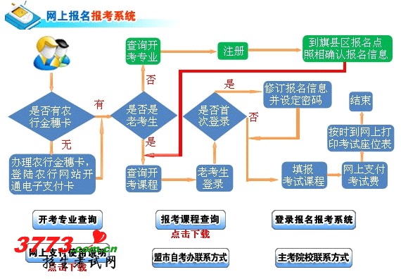 http://www.nm.zsks.cn/zxks/default.htm),进入网上报名报考系统。考生注册、查询开考专业、填报考试课程,以及交纳报考费等内容全部在网上进行;新生注册后需要到旗县区报名点现场扫描二代身份证、照相、确认报名信息。