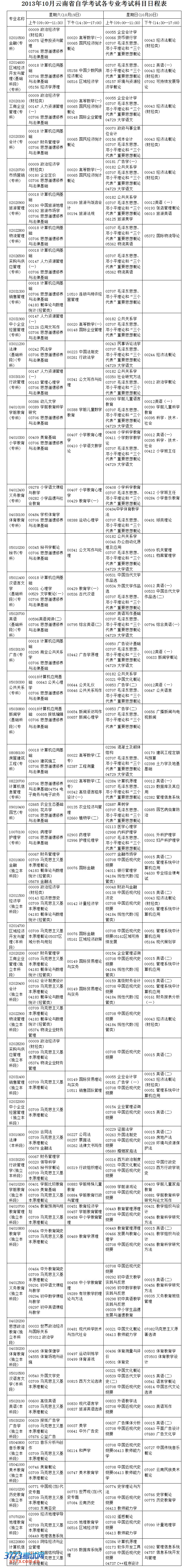 二○一三年十月云南省自学考试开考专业及考试科目日程表