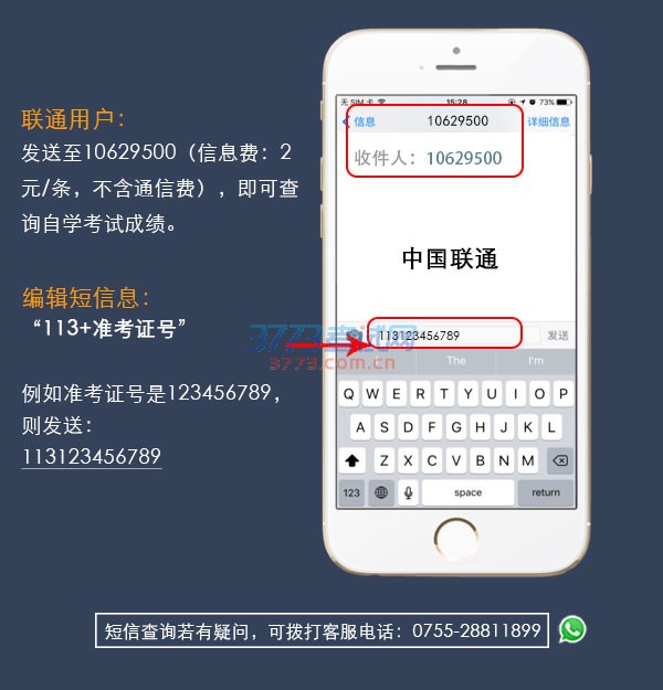 ●广东地区的联通用户编辑短信息:“ 113+准考证号”发送至10629500 ”即可查询自学考试成绩。(信息费:2元/条,不含基本通信费)客服电话:0755-28811899。(提示编辑手机短信时不需要输入+号,连续输入数字即可)