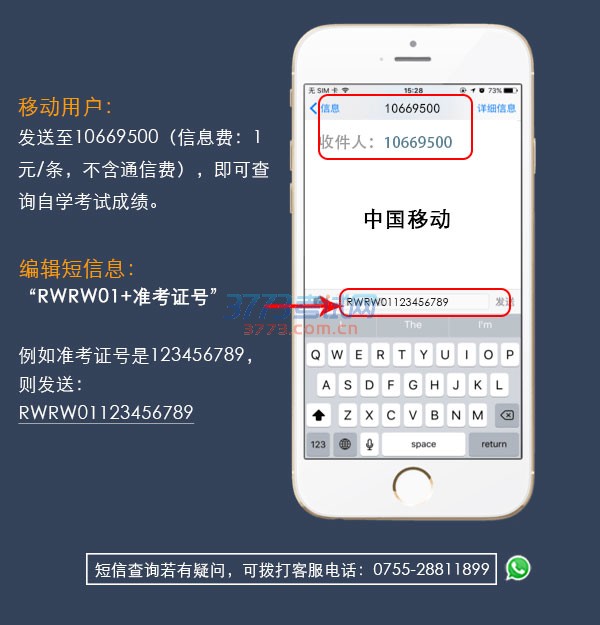 ●广东地区的移动用户编辑短信息:“ RWRW01+准考证号”发送至10669500 ”即可查询自学考试成绩。(信息费:1元/条,不含基本通信费)客服电话:0755-28811899。(提示编辑手机短信时不需要输入+号,连续输入数字即可)