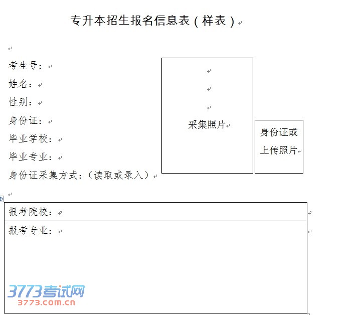 考生毕业院校使用第二代居民身份证阅读器联网读取考生第二代居民身份证信息,同时使用摄像头联网采像。考生毕业专业、联系方式等相关信息由毕业学校录入报名系统。考生报名基本信息录入完成后,报名系统即时生成考生号,考生即可打印《2014年专升本报名信息登记表》,加盖就读院校公章。