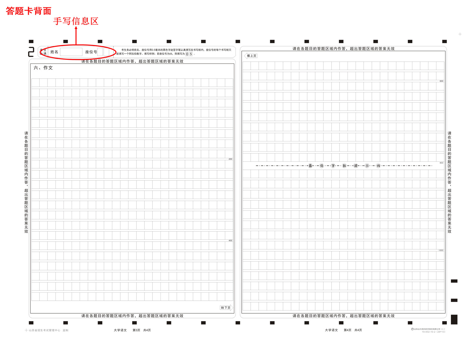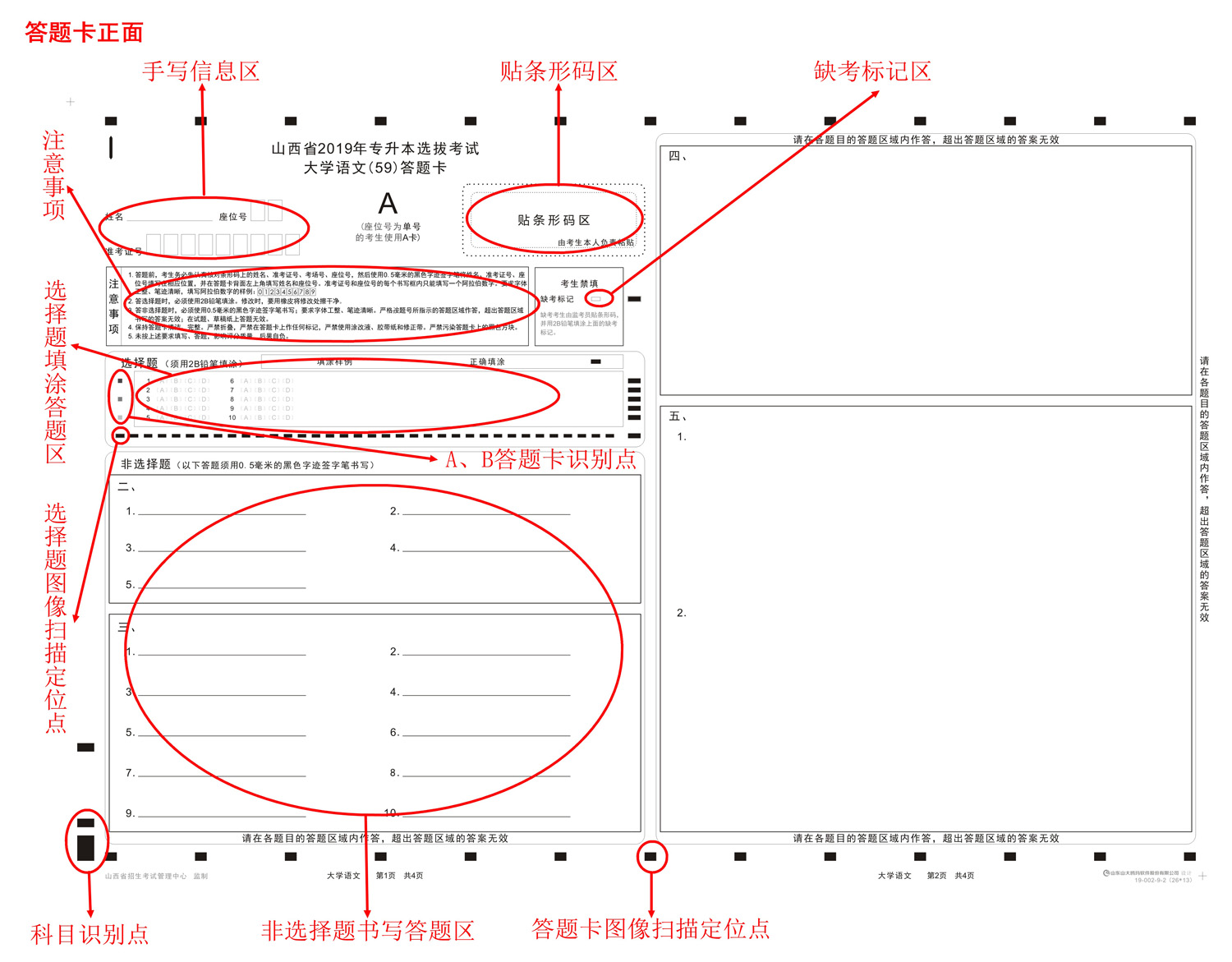 答题卡的格式:答题卡设计采用主客观一体化设计,选择题和非选择题的答题区域全部在同一张答题卡上。英语听力、英语和综合英语科目用A4答题卡,其它科目用A3答题卡。两门公共基础课答题卡分A卡、B卡两种类型,专业综合课答题卡不分A卡、B卡。