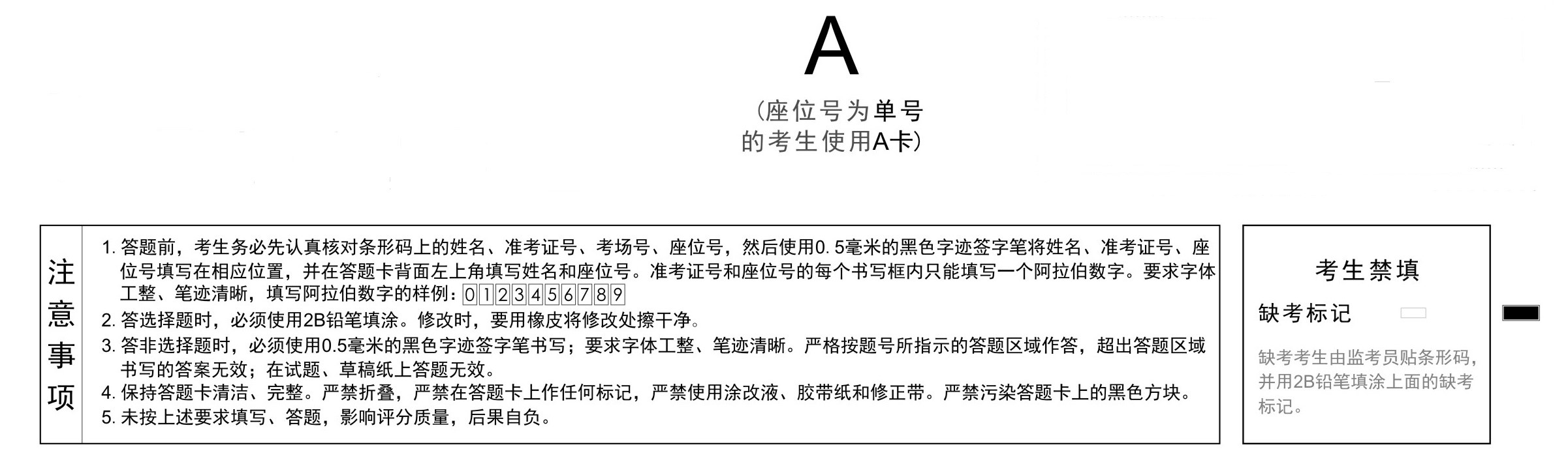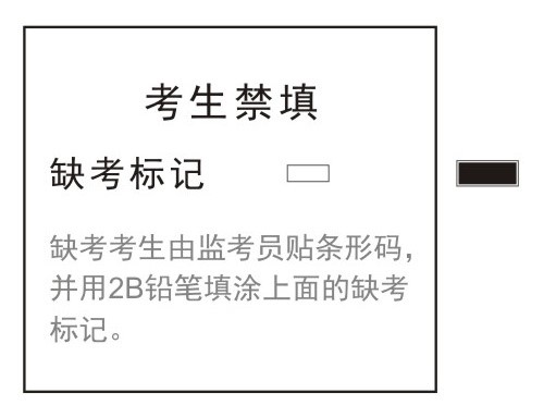 严禁考生本人填涂缺考标记。如有考生缺考,由监考教师用0.5mm蓝色字迹签字笔填写正面手写区的姓名、准考证号、座位号和背面卡头手写区的姓名、座位号,并在缺考标记区用2B铅笔涂黑缺考标记。
