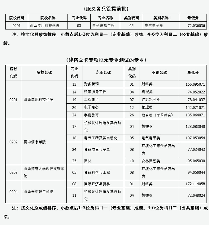 山西省2021年普通高校专升本选拔考试服义务兵役提前批、建档立卡专项批院校征集志愿公告(三)投档最低分